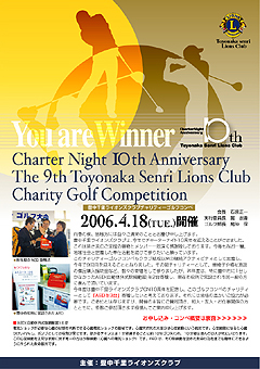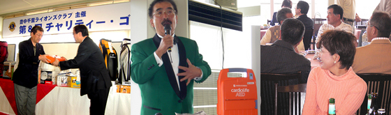 1997年の第1回開催以来、毎年恒例となったこのチャリティーゴルフコンペには毎回150〜180名の皆様のご参加とご協力を得ています。今年で9回目。その間、チャリティーとして車椅子を3年連続合計30台、福祉事業基金50万円を豊中市へ寄贈。そして昨年度は豊中市で消防署に1台だけだった「AED(自動体外式除細動器)」を豊中市健康福祉部通じて豊中市へ2台寄贈し、大変喜んでいただいきました。