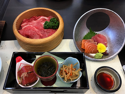 ミシガン下船後は楽しいお昼ごはん=岡喜本店「近江牛しゃぶしゃぶ」とあって期待も半端ではありません〜一通りの例会を行って、いよいよ食事懇談。さてさて近江牛とやらのお味は〜〜GOO!!〜美味短い時間の豪華なお昼でした。近江牛を後にして〜次はラコリーナ近江八幡へ。